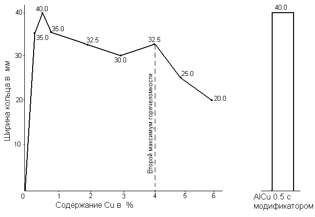 Рис.12 Изменение горячеломкости сплавов системы Al – Si На том же рисунке (12) приведено значение горячеломкости сплава, содержащего 0.25% Si с добавкой модификатора, в качестве которого использовался Zr в количестве 0.1%. Видно, что введение модификатора не оказывает влияния на снижение горячеломкости. На рисунке 13 представлено изменение горячеломкости сплавов системы Al – Cu в зависимости от содержания меди. Максимальной горячеломкостью обладает сплав, содержащий 0.5% Cu. Модифицирование сплава данного состава так же, как и в предыдущем случае, не приводит к снижению горячеломкости. При увеличении содержания меди в этой системе после точки максимальной горячеломкости снижение горячеломкости протекает более умеренно, чем в системе Al – Si. После некоторого снижения, при содержании меди, равном 4%, вновь наблюдается увеличение горячеломкости, и лишь при концентрациях меди выше 4% имеет место заметное снижение горячеломкости. Появление второго максимума горячеломкости объясняется в данном случае развитием обратной ликвации (микроструктурный анализ показал, что в кольцевых пробах сердцевина сильно обеднена медью, а поверхностные слои обогащены ею по сравнению с нормальной структурой сплава). В тройной системе Al – Si – Cu (рисунок 14) при увеличении концентрации кремния и меди существенное снижение склонности к образованию горячих трещин после достижения максимума горячеломкости (42.5 мм) обуславливается главным образом влиянием кремния (образованием эвтектической составляющей). Уже при содержании обоих легирующих элементов в количествах выше 3%, горячеломкость снижается до такого уровня (15-22.5 мм), который позволяет гарантированно получать свободные от горячих трещин сложные по конфигурации отливки методами литья в постоянные металлические формы. Эффективный интервал кристаллизации при добавлении к чистому металлу второго компонента возрастает, достигает максимума на концентрационной границе появления эвтектики и затем постепенно уменьшается до нуля в точке совпадения температуры начала линейной усадки с эвтектической горизонталью. Горячеломкость тем больше, чем больше эффективный интервал кристаллизации, и поэтому состав сплава должен совпадать с границей появления эвтектики. Это положение сыграло важную роль в изучении зависимости горячеломкости от состава, так как оно позволило связать сопротивляемость сплавов образованию трещин с диаграммой состояния и, в первом приближении, предсказать область составов наиболее горячеломких сплавов. Появление эвтектики и распределение её по границам кристаллитов в виде тонких прослоек существенно охрупчивает сплав, снижая его механические свойства, и, следовательно, его способность сопротивляться возникающим напряжениям. Кроме того, у сплавов с наибольшим эффективным интервалом кристаллизации линейная усадка в этом интервале получает максимальное