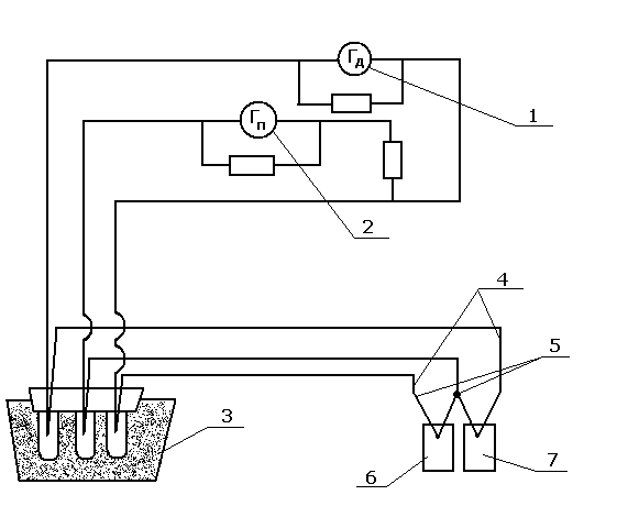 Рис. 16 Принципиальная схема пирометра Н.С. Курнакова 1 – дифференциальный гальванометр; 2 – простой гальванометр; 3 – сосуд Дьюара; 4 – дифференциальная термопара; 5 – простая термопара; 6 – образец; 7 – эталон.