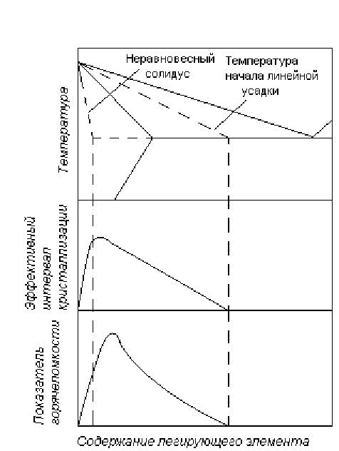 Рис.3 Несовпадение максимумов эффективного интервала кристаллизации и горячеломкости в системе эвтектического типа Рассмотрим, в каком интервале концентраций вообще появляется горячеломкость. Сплавы, находящиеся в области составов от «критической» точки до эвтектической, казалось бы, вообще не должны быть горячеломкими, так как эффективный интервал у них равен нулю, а кристаллизация эвтектики, протекающая при постоянной температуре, сама по себе не должна вызывать образования усадочных трещин. В действительности же на сложных фасонных отливках можно встретить кристаллизационные трещины и в этой группе сплавов. Из-за градиента температур усадка одних частей отливки, успевших полностью затвердеть, вызывает растяжение соседних более горячих участков, находящихся ещё в стадии кристаллизации эвтектики. Растяжение участков, где имеется остаточная жидкая фаза, может привести к образованию кристаллизационных трещин. Таким образом, сплавы с нулевым эффективным интервалом кристаллизации могут проявлять горячеломкость, т.е. не существует абсолютно негорячеломких сплавов. Состав сплава с максимальной горячеломкостью в каждой системе весьма постоянен: он практически не зависит от степени перегрева расплава, скорости охлаждения и геометрии отливки. С повышением температуры кокиля наблюдается лишь незначительная тенденция к смещению максимума горячеломкости в сторону менее легированных сплавов. Минимальная концентрация второго компонента, при которой экспериментально фиксируемая горячеломкость исчезает, наоборот, зависит от условий литья. Интервал концентраций, в котором обнаруживается горячеломкость, расширяется с увеличением степени перегрева расплава, увеличением скорости охлаждения и увеличением диаметра кольцевой пробы. Последние два фактора делают пробу более жёсткой, так как увеличивают градиент температур и усиливают локализацию усадочных деформаций, и поэтому способствуют выявлению горячеломкости до больших концентраций легирующего элемента. Увеличение перегрева расплава действует в том же направлении, так как расширяет область составов сплавов, в которых образуются столбчатые кристаллы. Объясняя причину снижения горячеломкости при увеличении количества эвтектики в сплаве, на первое место часто ставят способность эвтектической жидкости залечивать образующиеся трещины. С этим нельзя согласиться, так как эвтектика не обладает какой-то особой, резко отличной от неэвтектической жидкости способностью заполнять возникающие трещины. Снижение горячеломкости при увеличении количества эвтектики в сплаве происходит благодаря росту запаса пластичности в твёрдо-жидком состоянии, а последний увеличивается как в результате повышения удлинения в интервале хрупкости, так и уменьшения линейной усадки. Главной причиной этого является увеличение количества жидкой фазы, кристаллизующейся в последнюю очередь при постоянной температуре. Такой фазой может быть не только эвтектика, но и жидкость перитектического состава и фаза, кристаллизующаяся в точке минимума на диаграмме плавкости непрерывного ряда твёрдых растворов. Другой фактор, благоприятно сказывающийся на пластичности и линейной усадке в твёрдо-жидком состоянии – измельчение зерна, в особенности сужение зоны столбчатых кристаллов, прои