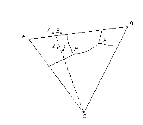 Рис. 4 Тройная система с двойным соединением, образующимся по перитектической реакции. правило, можно значительно уменьшить, лишь очень сильно изменив состав сплава. 1.2.2. Второй способ снижения горячеломкости – регулирование содержания основных компонентов в пределах допусков ГОСТа или технических условий. Здесь применимы те же приёмы, что и при разработке нового сплава, но рамки изменения химического состава строго ограничены. Однако и в тесных границах ГОСТа, регулируя содержание основных компонентов, можно значительно увеличить количество жидкой фазы и нижней части эффективного интервала кристаллизации, существенно снизить температуру начала линейной усадки или же поднять температуру солидуса. Для каждого стандартного сплава, если при литье его наблюдается чистый брак по кристаллизационным трещинам, необходимо установить оптимальный в пределах допусков по ГОСТу состав, соответствующий минимуму горячеломкости. Этот путь снижения горячеломкости ещё недостаточно широко используется, и здесь имеются скрытые резервы уменьшения брака по усадочным трещинам в производстве слитков и фасонных отливок. 1.2.3. Третий путь снижения горячеломкости – регулирование содержания примесей в сплаве. Изменение содержания примесей может сильно повлиять на нижнюю границу интервала хрупкости и величину относительного удлинения в нём, практически не сказываясь на верхней границе интервала хрупкости и температуре начала линейной усадки. Наиболее вредны легкоплавкие примеси, образующие по границам зёрен плёнки большой протяжённости, так как они резко расширяют температурный интервал хрупкости. Давно известен способ снижения горячеломкости удалением легкоплавких примесей из сплава. Если полностью избавиться от такой примеси не удаётся, то можно снизить содержание её до такого уровня, чтобы она находилась в виде изолированных включений, а не в виде плёнок. В последнем случае, хотя точка начала плавления сплава не повышается, нижняя граница интервала хрупкости может значительно подняться над солидусом. Когда и это осуществить не удаётся, можно прибегнуть к искусственному увеличению легкоплавкой примеси в сплаве. Этот способ снижения горячеломкости основан на том, что утолщение легкоплавких плёнок облегчает межзёренную деформацию и повышает относительное удлинение в нижней части интервала хрупкости. Ослабление вредного влияния легкоплавкой примеси путём повышения её концентрации в сплаве – интересный способ. Но он сравнительно редко может быть использован из-за вредного действия этой примеси на эксплуатационные свойства сплава. 1.2.4. Четвёртый путь снижения горячеломкости – введение в сплав малых технологических добавок. Под технологическими добавками понимают такие малые добавки, основной целью введения которых является снижение горячеломкости. Технологические добавки могут резко повысить нижнюю границу интервала хрупкости, значительно опустить верхнюю его границу и температуру начала линейной усадки, а также повысить относительное удлинение в интервале хрупкости. С давних пор для снижения горячеломкости используется способ введения добавок, связывающих вредные примеси в более тугоплавкие соединения (например, введение магния для обезвреживания серы в никеле). При этом нижняя граница интервала хрупкости