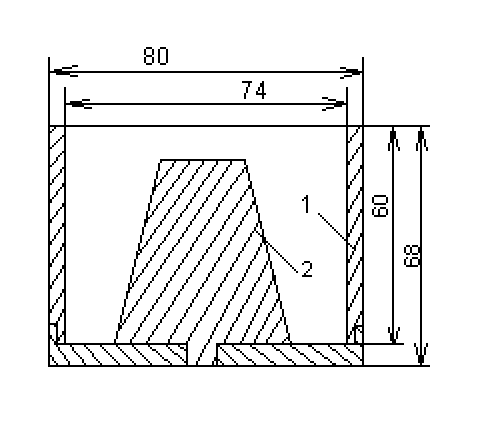 Рис. 5 Кокиль для кольцевой пробы на горячеломкость 1 – съёмный стакан; 2 – стержень разных диаметрах стержня кольцевые пробы обладают разной жёсткостью. Чем больше диаметр стержня, тем больше жёсткость пробы. Именно поэтому, приводя сведения о горячеломкости, необходимо указывать диаметр стального стержня, использованного при отливке кольцевой пробы. В большинстве случаев достаточно шести повторных опытов (заливок), чтобы надёжно определить показатель горячеломкости (суммарную длину всех трещин или относительную длину основной трещины). Длину трещины, которая бывает весьма извилиста, удобно измерять с помощью простого приспособления: укреплённое на конце рукоятки зубчатое колесо катится вдоль трещины и подсчитывает число полных его оборотов, а при неполном обороте – число зубьев, коснувшихся поверхности кольца. Кристаллизационная трещина в принципе может развиваться в длину как в интервале кристаллизации, так и при температуре ниже солидуса. Поэтому естественен вопрос, какова уверенность в том, что на кольцевой пробе измеряется длина трещин чисто кристаллизационного происхождения. Фрактологический анализ многочисленных кольцевых проб из самых разнообразных цветных сплавов наглядно показал, что в подавляющем большинстве случаев на всей своей длине трещины на поверхности кольца имели кристаллизационное происхождение. Кроме того, данные о запасе пластичности в твёрдо-жидком состоянии и результаты измерения длины трещин на кольцевых пробах, как правило, очень хорошо согласуются. Следовательно, за редкими исключениями, (например, сплавы с очень высокой хрупкостью в твёрдом состоянии), на кольцевых пробах измеряется длина именно кристаллизационных трещин. Это не значит, что все получаемые с помощью кольцевой пробы сплавы не склонны к образованию холодных трещин. Рассматриваемая кольцевая проба обладает сравнительно небольшой жёсткостью, и поэтому холодные трещины на ней при изучении цветных сплавов появляются крайне редко. Само образование радиальной кристаллизационной трещины приводит к разрядке усадочных напряжений в кольце и этим уменьшает вероятность образования холодной трещины в нём. В то же время при непрерывном литье, когда в охлаждаемом водой слитке возникают очень большие термические напряжения, в кокильных отливках сложной конфигурации и при сварке, когда наблюдается сильная концентрация усадочных напряжений, типичные холодные трещины могут появиться и у тех сплавов, у которых, согласно кольцевой пробе, проявляется только горячеломкость. Относительная длина основной трещины на кольцевых пробах изменяется при изменении состава сплава примерно так же, как суммарная длина всех трещин. Одновременно с развитием трещины в длину происходит её раскрытие, увеличение ширины. Длина и средняя ширина изменяются с составом качественно одинаково. Поэтому площадь трещины на поверхности кольца (произведение её длины на среднюю ширину) изменяется с составом качественно так же, как и длина трещины. Но измерение площади трещины существенно повышает трудоёмкость работы с кольцевой пробой. Для большинства исследований вполне достаточна чувствительность кольцевой пробы с измерением длины трещин. На поверхности отливки измеряется длина макротрещины, которая может объединять многочисленные межкриста