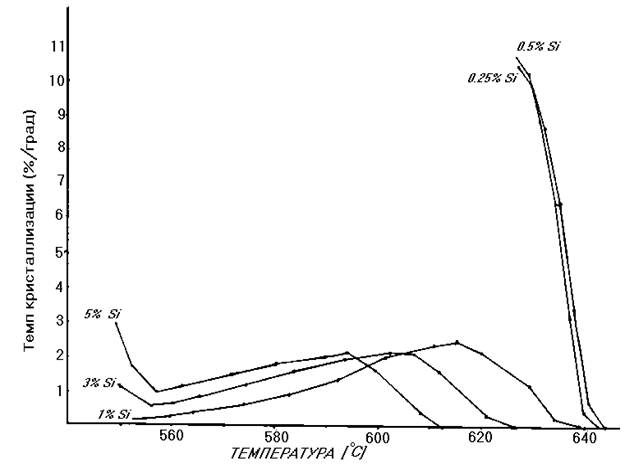 Дальнейший анализ приведённых данных показал: 1. Сплавы, содержащие 0.25 и 0.5% Si, имеют узкий интервал кристаллизации (~16°C). На кривых ДТА для этих сплавов не зафиксировано эвтектическое превращение, т.е. тепловое превращение связано только с кристаллизацией a-твёрдого раствора кремния в алюминии. Параметры кристаллизационного процесса этих двух сплавов практически одинаковы. 2. В сплавах с содержанием Si 1.0% и выше зафиксирована кристаллизация эвтектической составляющей, причём чем больше в сплаве кремния, тем больше эвтектики. Поэтому интервал кристаллизации этих сплавов значительно больше, так как в этом случае участвуют два превращения – кристаллизация твёрдого раствора и эвтектики, протекающая для этих составляющих при различных температурах. Обращает на себя внимание тот факт, что с увеличением содержания кремния с 1.0 до 5.0% интервал кристаллизации уменьшается с 87 до 64° С. Это связано с тем, что с увеличением кремния ликвидус сплавов существенно снижается, а солидус остаётся практически неизменным, так как кристаллизация этих сплавов завершается кристаллизацией эвтектики (a + Si) при постоянной температуре. По кривым ДТА были рассчитаны и графически интерпретированы кривые изменения темпа кристаллизации опытных сплавов (рисунок 18). Для сплавов 0.25 и 0.5% Si темп кристаллизации увеличивается практически линейно и достигает максимальных и больших по абсолютной величине значений у температуры солидус. Аналогично должна развиваться и линейная усадка в интервале кристаллизации, что в сумме с наличием тонких прослоек жидкого металла между кристаллами, ослабляющих их связь, приводит к увеличению горячеломкости. Характер изменения темпа кристаллизации сплавов с содержанием кремния от 1.0 до 5.0% существенно отличается. Достигнув максимума в начале кристаллизации, когда линейная усадка ещё не получила своего развития, темп кристаллизации затем плавно снижается с приближением к температуре солидус. И только у сплавов, содержащих 3.0 и 5.0% Si, вблизи температуры солидус темп кристаллизации вновь несколько увеличивается. Но это происходит практически при неизменной температуре кристаллизации эвтектической составляющей, когда линейная усадка приостанавливает своё развитие и вновь начинает увеличиваться только после полного затвердевания сплава. Такой характер кристаллизации должен благоприятно сказываться на снижении горячеломкости, что подтверждается результатами исследований этого сплава с помощью кольцевой пробы.