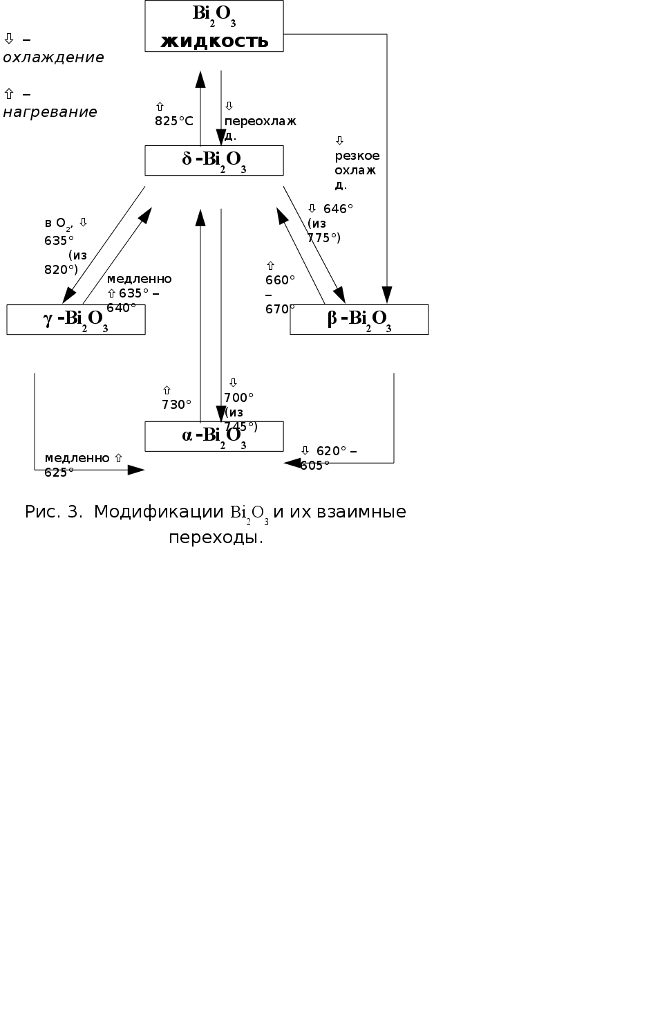 3.2 Свойства. d-Bi2O3 плавится при 825°С [12]. Для температуры кипения в [9] приводится значение 1890°С. DfH°298 (a-Bi2O3) = – 577 кДж/моль [9]. Оксид висмута (III) нерастворим в воде и растворах щелочей. Кислотами переводится в соли висмута (III): Bi2O3 (тв) + 6HCl (р) = 2BiCl3 (p) + 3H2O. b-, g- и d-модификации оксида висмута являются анионными проводниками с незначительным вкладом электронной проводимости, тогда как a-Bi2O3 – полупроводник [11]. 3.3 Получение. Наилучшим способом получения оксида висмута считается взаимодействие растворов солей висмута (III), например нитрата Bi(NO3)3 или сульфата Bi2(SO4)3, с избытком раствора щелочи: Bi(NO3)3 + 3NaOH = Bi(OH)3Ї +3NaNO3. В осадок выпадает гидроксид висмута, который затем обезвоживают прокаливанием:
