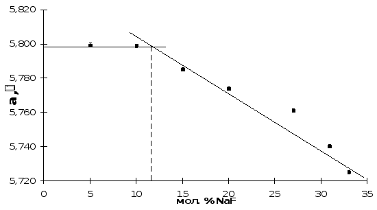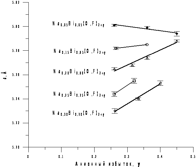 Рис. 10. Параметры кубической элементарной ячейки фазы Ф разреза NaxBi1-x(O,F)2,36.