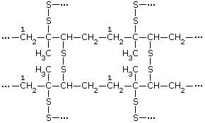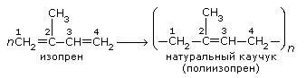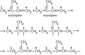 Можно считать, что макромолекулы каучука образованы молекулами изопрена. Представим этот процесс схематично. Сначала за счёт разрыва двойных связей происходит соединение двух молекул изопрена