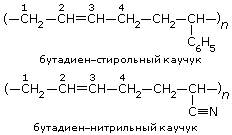 Отличительной особенностью процесса полимеризации является то, что при этом молекулы исходного вещества или веществ соединяются между собой с образованием полимера, не выделяя при этом каких-либо других веществ. Важнейшие виды синтетического каучукаВышерассмотренный бутадиеновый каучук (СКБ) бывает двух видов: стереорегулярный и нестереорегулярный. Стереорегулярный бутадиеновый каучук применяют главным образом в производстве шин (которые превосходят шины из натурального каучука по износостойкости), нестереорегулярный бутадиеновый каучук[6] — для производства, например, кислото- и щелочестойкой резины, эбонита. В настоящее время химическая промышленность производит много различных видов синтетических каучуков, превосходящих по некоторым свойствам натуральный каучук. Кроме полибутадиенового каучука (СКБ), широко применяются сополимерные каучуки — продукты совместной полимеризации (сополимеризации) бутадиена с другими непредельными соединениями, например, со стиролом (СКС) или с акрилонитрилом (СКН):