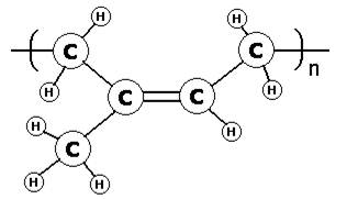 Как видно из этой схемы, при полимеризации изопрена раскрываются обе его двойные связи, а в элементарном звене полимера двойная связь возникает на новом месте — между атомами углерода 2 и 3. Природный каучук содержится в млечном соке каучуконосных растений, главным образом, тропических (например, бразильского дерева гевея). Другой природный продукт — гуттаперча — также является полимером изопрена, но с иной конфигурацией молекул[5]. Длинную молекулу каучука можно было бы наблюдать непосредственно при помощи современных микроскопов, но это не удаётся, так как цепочка слишком тонка: диаметр её, соответствующий диаметру одной молекулы, составляет примерно 2∙10-10 м. Если макромолекулу каучука растянуть до предела, то она будет иметь вид зигзага, что объясняется характером химических связей между атомами углерода, составляющими скелет молекулы. Звенья молекулы каучука могут вращаться не беспрепятственно в любом направлении, а ограниченно — только вокруг одинарных связей. Тепловые колебания звеньев заставляют молекулу изгибаться, при этом концы её в спокойном состоянии сближены. При растяжении каучука концы молекул раздвигаются и молекулы ориентируются по направлению растягивающего усилия. Если устранить усилие, вызвавшее растяжение каучука, то концы его молекул вновь сближаются и образец принимает первоначальную форму и размеры. Молекулу каучука можно представить себе как круглую, незамкнутую пружину, которую можно сильно растянуть, разведя её концы. Освобождённая пружина вновь принимает прежнее положение. Некоторые исследователи представляют молекулу каучука в виде пружинящей спирали. Качественный анализ показывает, что каучук состоит из двух элементов — углерода и водорода, то есть, относится к классу углеводородов. Первоначально принятая формула каучука была C5H8, но она слишком проста для такого сложного вещества как каучук. Определение молекулярной массы показывает, что она достигает нескольких сот тысяч (150 000 — 500 000). Каучук, следовательно, природный полимер. Экспериментально доказано, что в основном макромолекулы натурального каучука состоят из остатков молекул изопрена, а сам натуральный каучук — природный полимер цис-1,4-полиизопрен. Структурная формула его такова: