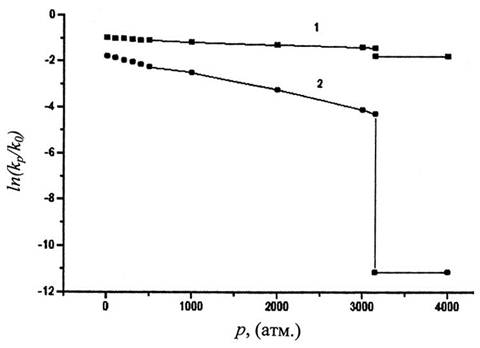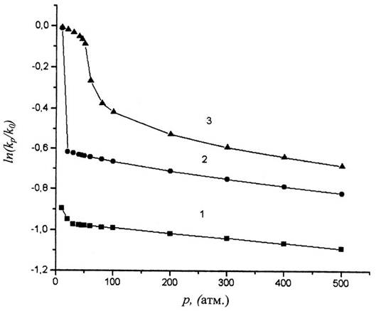 Влияние высокого давления на скорость реакции в растворе - это область кинетики, наиболее изученная экспериментально. Обзор [10] содержит данные о примерно 500 реакций, из них 22 относятся к мономолекулярным. Для анализа экспериментальных данных методом теории свободного объема необходимо иметь уравнение состояния растворителя, включающее области температуры и давления, использованные в экспериментах. Часто это затруднительно. Справочник [11] содержит табулированные уравнения состояния для ряда жидкостей в диапазоне давлений до 500 атм. Для некоторых жидкостей имеются зависимости V(p) для отдельных значений температур, часто эти температуры лежат в стороне от температур, необходимых для исследования химической кинетики. В
