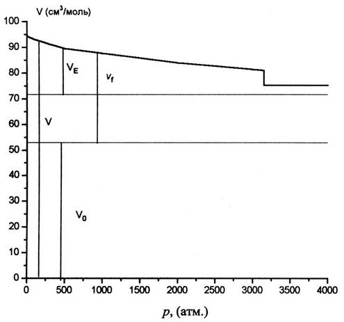 При р=1 атм. vf= 41 см3/моль, a VE =18,4 см3/моль. При р=3125 атм. чистый бензол затвердевает со скачкообразным уменьшением объема на DVs,l =5,7 см3/моль [15]. Эта величина составляет при р = 1 атм. 6% от V(1), 14% от vfи 32% от VE.