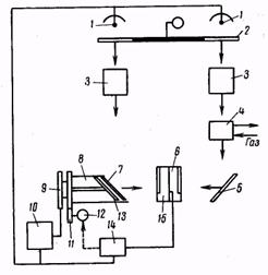 схема газоанализатора. Инфракрасное излучение от двух источников 1