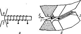 а — с внутренней конвекцией; б — с внешней конвекцией: 1 — термоанемометр, расположенный под магнитными полюсами; 2 — термоанемометр, расположенный под ложными немагнитными наконечниками Измерение термомагнитных усилий термоанемометрическим способом получило наибольшее применение. Термоанемометры, использующиеся для этих целей, разделяют на термоанемометры с внутренней конвекцией (рис. 11, а) и внешней конвекцией (рис. 11,6). Термоанемометры с внешней конвекцией представляют собой цилиндрический капилляр, на внешней поверхности которого намотана платиновая спираль, защищенная от воздействия АГС покрытием, обычно остеклованием. Принцип действия газоанализатора с термоанемометрами с внешней концентрацией аналогичен ранее описанному. При наличии в АГС кислорода единичный объем этого газа втягивается в воздушный зазор магнитной системы, подвергается воздействию теплового поля термоанемометра 1, расположенного под полюсами магнита, нагревается, теряет свои магнитные свойства и вытесняется более холодным газом, втягивающимся в неоднородное магнитное поле рабочего зазора магнитной системы. Образовавшийся поток термомагнитной конвекции FM охлаждает первый термоанемометр и частично передает свое тепло второму термоанемометру 2, расположенному под ложными немагнитными наконечниками измерительной камеры. Электрическое сопротивление первого термоанемометра уменьшается, а второго возрастает. По их разности судят о концентрации кислорода в. АГС. Использование термомагнитного метода при конструировании газоанализаторов для определения концентрации кислорода связано с неоднозначностью функциональной связи между фактически измеряемой и искомой величиной. Эта неоднозначность вызвана зависимостью показаний прибора от свойств не только определяемого компонента АГС — кислорода, но и свойств реальной смеси. С другой стороны, поскольку измерение магнитной восприимчивости кислорода затруднительно ввиду ее малого значения, а использование косвенных методов измерения предполагает сложную цепь преобразования магнитной восприимчивости в поток термомагнитной конвекции с последующим его измерением термоанемометрическим способом, это приводит к дополнительным затруднениям и связанным с ними методическим погрешностям. На показания газоанализаторов влияют: неопределяемые компоненты пробы АГС, температура и давление пробы АГС. Перед разработчиками аналитических приборов стоят задачи обеспечения стабильности параметров при длительной эксплуатации; оптимальных динамических характеристик; необходимой технелогичности конструкций; универсальности, исключающей многообразие конструкций измерительных камер, схемных решений и т. п. Указанные задачи реализуют разнообразными средствами, главные из которых — создание специфичной конструкции измерительной камеры и чувствительного элемента, а также оригинальных схемных решений. Для устранения (уменьшения) влияния температуры и давления пробы АГС на показания прибора возможны следующие варианты: стабилизации параметров и компенсация влияния. Стабилизация параметров позволяет использовать простые и надежные конструкции измерительных камер, упрощает технологию изготовления и наладки газоанализаторов. Реализация компенсационных способов устранения (уменьш