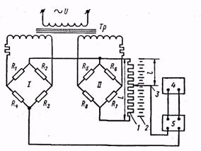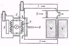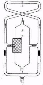 Рис. 14. Схема термомагнитного газоанализатора с О-образной камерой: / — резистор; 1 — магнитные наконечники; 3 — термоанемометр; 4 — измерительная камера; 5 — нагреватель; 6 — измерительный прибор; 7 — источник питания; S — усилитель На рис. 14 представлена схема одного из термомагнитных газоанализаторов, в котором использована О-образная измерительная камера.