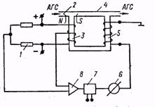 Измерительная камера 4 состоит из расположенного под магнитными наконечниками 2 термоанемометра 3, который вместе с элементами 1 мостовой схемы образует первичный измерительный преобразователь, реагирующий на изменение концентрации кислорода в пробе АГС. Сигнал с диагонали съема моста подается на вход усилителя 8, его выход связан с входом управляемого источника питания 7, нагрузкой которого служит нагреватель 5, являющийся устройством для создания компенсирующего патока тепловой конвекции. Измерительный прибор 6 включен в цепь питания нагревателя.