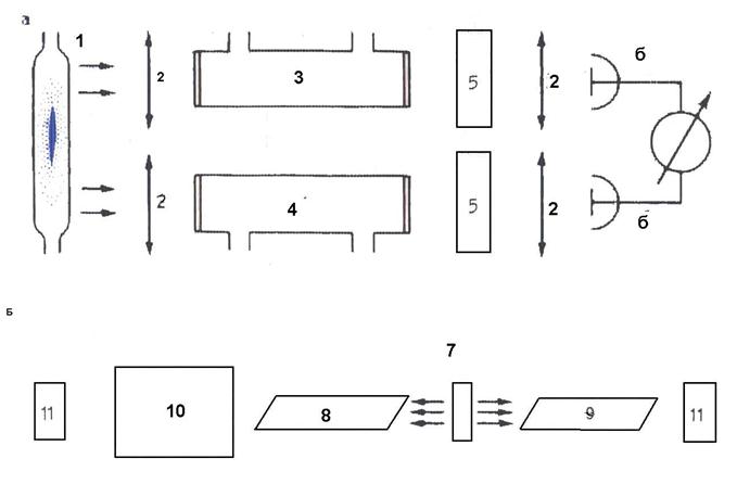 Рис. 18 Схема дифференциального абсорбционного газоанализатора с газоразрядным (тепловым) (а) и лазерным (б) источникам! зондирующего излучения: 1-газоразрядный или тепловой источник зондирующего излучения; 2-оптическая система формирования пучков излучения; 3, 5-рабочие кюветы; 4, 9-опорные кюветы; 5~фильтры; (5-приемники излучения; 7-полупроводниковый лазер; 10~диспергирующий элемент; 77-фото-приемники На фиг. 1 представлена функциональная схема предлагаемого оптического абсорбционного газоанализатора; на фиг. 2 - блок-схема реализованного оптического преобразователя газоанализатора. Газоанализатор, согласно фиг. 1,