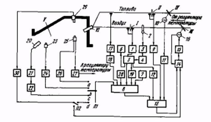 и дифференциатор 11 (ЭД). С помощью преобразователя 12 (БНП) реализуется зависимость, в соответствии с которой изменяются параметры динамической настройки регулятора 13 (РБИ-3) при изменении тепловой нагрузки. Для перехода на дистанционное управление служит блок 14 (БРУ-У), соединенный через пускатель 75 (ПРБ-74) с двигателем 16 (МЭО 25/100), перемещающим P.O. III. Теплота сгорания топлива контролируется датчиком 17 (КГ-7093.01), корректирующий импульс формируется во вторичном приборе 18 (КГ-7093.02). Коррекция задания при изменении тепловой нагрузки осуществляется с помощью блока 19 (БНП). Корректирующий импульс по содержанию О^ в продуктах сгорания зоны печи V может поступать в зависимости от положения переключателя 111 либо от комплекта, состоящего из устройства отбора и подготовки пробы 20, автоматического газового анализатора 21 (МН-5106) и интегратора 22 (БПИ), либо от датчика с твердым электролитом 23 в комплекте с преобразователем 24 (Циркон), либо, наконец, от датчика 25, расположенного в пламени горелки VI, и преобразователя 26. В последнем случае ТП датчика 25 через преобразователь 27 подключается на вход регулятора температуры рабочего пространства. Заданная концентрация О2 в месте установки соответствующего датчика вводится с помощью задатчика 28 (РЗД). Экстремальное регулирование выполняется с помощью датчика 29 (ТЕРА-50) и экстремального регулятора 30 (ЭРБ), подключаемого через ключи 111 и П2 к сумматору блока 8 или через ключ П2 непосредственно к блоку 14 в зависимости от типа выходного сигнала регулятора 30. При переводе переключателя Я в положение а, Ъ и d элементы схемы 1, 2, 3, 4, 5, 6, 7, делитель блока 8, элементы 9, 17, 18, 19, 20, 21 и 22 непосредственно в регулировании могут не участвовать. Наладка системы на объекте состоит в определении исходных параметров динамической настройки регулятора 13, выполняемом по известным методикам на основании кривой разгона, снятой при тепловой нагрузке порядка 70-80% от максимальной; настройке блока 12 для обеспечения постоянного характера переходного процесса в широком диапазоне изменения тепловой нагрузки и настройке блока 19 по результатам газового анализа для обеспечения постоянного состава атмосферы печи. Все остальные элементы проходят предварительную приборную наладку в соответствии с инструкциями по их эксплуатации до установки на объекте и периодически поверяются в дальнейшем. При. сжигании топлива одна из главных проблем — обеспечение оптимального соотношения между количеством подаваемых в топку топлива и воздуха. Для каждой конкретной установки существует оптимальный избыток воздуха, который соответствует наиболее экономичному протеканию процесса сжигания. Недостаток воздуха при горении способствует образованию токсичных продуктов неполного сгорания, вызывает перерасход топлива. Избыток воздуха также приводит к перерасходу топлива на нагрев лишнего воздуха в составе отходящих газов. В обоих случаях сжигание топлива сопровождается повышенным выбросом в атмосферу высокотоксичных оксидов азота. Одним из наиболее достоверных способов определения избытка воздуха является анализ газовой cмеси, покидающей камеру сгорания, а именно определение концентрации кислорода в топочных газах. В соответствии с «Инструкцией по проектированию и безопасной эксплуатации факельных установок для горючих газов и паров» долже