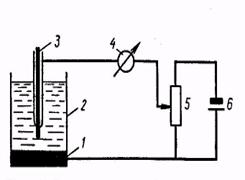 Рис. 5. Схема плолярографа: 1 — анод (слой ртути на дне ячейки); 2— электролит; 3 — катод (ртутный капельный электрод); 4 — микроамперметр; 5 — реостат; 6— источник питания Потенциал электрода На рис. 5 изображена схема полярографа, состоящего из полярографической ячейки, устройства для подачи потенциала — источника питания 6, реостата 5 и микроамперметра 4. Полярографическая ячейка представляет собой стеклянный сосуд с электролитом 2. В ячейке помещены два электрода: катод 3 и анод 1. Катод — ртутный капельный электрод — имеет малую поверхность, через которую при электрохимическом восстановлении протекают большие токи. Вследствие этого потенциал катода отличается от равновесного потенциала, необходимого для проведения электрохимической реакции, т. е. происходит поляризация катода. В качестве анода (электрода сравнения) применяют хлор-серебряный, каломельный электроды или электрод с большой поверхностью, часто слой ртути 1, находящийся на дне ячейки. Большая поверхность электрода сравнения нужна для снятия явления поляризации. Напряжение (2—4 В) от внешнего источника питания 6 через реостат 5 подается на ртутные электроды полярографической ячейки. Ток, проходящий через ячейку, измеряют микроамперметром 4, а напряжение, подаваемое на ячейку, регулируют перемещением движка на реостате 5 от нуля (крайнее нижнее положение) до максимума (крайнее верхнее положение). При электролизе происходят следующие процессы: перенос деполяризатора из раствора на поверхность электрода, электрохимическая реакция, выделение конечных продуктов реакции на поверхность электрода или выделение их обратно в раствор. Скорость электрохимической реакции зависит в основном от скорости переноса деполяризатора к поверхности электрода. Перенос деполяризатора в растворе к электроду осуществляется диффузией, конвекцией и миграцией. Значение электрического тока, проходящего через полярографическую ячейку при постепенном увеличении потенциала ртутной капли — катода и наличии деполяризатора в растворе, подчиняется законам диффузии. Зависимость силы электрического тока от градиента концентрации и коэффициента диффузии потенциалопределяющих ионов у поверхности плоского электрода и стационарном состоянии (расстояние от поверхности электрода x= 0) выражается уравнением :