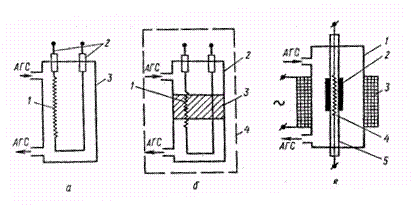 а — без катализатора: 1 — платиновая нить; 2 — держатель; 3 — измерительная ячейка; б — чувствительный элемент расположен в катализаторе: 1 — чувствительный элемент; 2 — измерительная ячейка; 3 — катализатор; 4 — термостат; в — чувствительный элемент расположен в керамической трубке; 1 — камера; 2 — катализатор; 3—электрическая спираль; 4 — чувствительный элемент; 5 — керамическая трубка В ячейке (рис. 3, а) проба АГС проходит через измерительную ячейку 3, в которой размещен ЧЭ в виде платиновой нити 1, укрепленной на держателях 2. Платиновая нить нагревается электрическим током до температуры, при которой происходит реакция. Выделившаяся теплота сгорания повышает температуру нити, увеличение температуры пропорционально концентрации определяемого компонента. Повышение температуры измеряется по изменению сопротивления нити, включенной, как правило, в схему электрического четырехплечего моста. В ячейке (рис. 3, б) предусмотрено использование катализатора 3, в котором размещен ЧЭ 1. Обычно такая измерительная ячейка 2 размещается в термостате 4. При протекании пробы АГС через измерительную ячейку на катализаторе происходят соответствующая реакция, сопровождающаяся выделением тепла. Изменение температуры катализатора измеряется ЧЭ. Такой тип измерительной ячейки реализован в газоанализаторе ТХГ-5, где используются две измерительные ячейки: рабочая, через которую пропускают пробу АГС, и сравнительная с инертным газом. Ячейка (рис. 3, в) представляет собой камеру 1, обогреваемую электрической спиралью 3. В камере расположена керамическая трубка 5, часть внешней поверхности которой покрыта катализатором 2. В керамической трубке находится ЧЭ 4, измеряющий ее температуру. Такой тип измерительной ячейки используют при создании газоанализатора на кислород в азоте. Для обеспечения термохимического эффекта к пробе АГС прибавляют водород, являющийся вспомогательным газом для протекания реакции Н+1/2О2 = Н2О. В измерительную ячейку помещена фарфоровая трубка, обогреваемая электрическим током. Каталитическое сжигание водорода происходит на измерительных спаях термостолбиков («10 термопар, соединенных последовательно). Преимущества термохимического метода: высокая чувствительность и возможность определять концентрации практически всех горючих газов и паров. Недостатки — вероятность отравления чувствительного элемента каталитическими ядами, а также потребность во вспомогательном газе. Многочисленные термохимические сигнализаторы и газоанализаторы используют для определения довзрывных концентраций горючих газов, а также горючих компонентов в отходящих газах тепловых объектов. Поскольку необходимым условием протекания окислительной реакции является наличие кислорода в пробе АГС, метод позволяет определять концентрацию молекулярного кислорода в смеси с горючими газами. Газоанализаторы ВТИ-2, ГХЛ-1, ГХЛ-2.Предназначены для раздельного определения концентрации кислотных газов (СО2 SО2, H2S и др.), кислорода и монооксида углерода, суммы непредельных углеводородов (СnH2n) и водорода в пределах от 0 до 100 % (об.). Кроме того, с помощью этих газоанализаторов определяют сумму предельных углеводородов (СnН2n+2). Газоанализаторы ГХЛ-1 и ГХЛ-2 — новые объемно-химические газоанализаторы. В ГХЛ-1 предусмотрено использование сжатого воздуха для прок