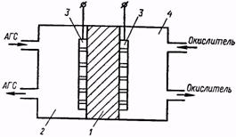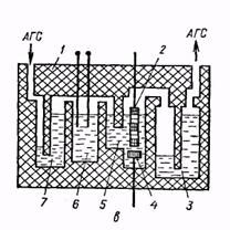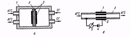 В твердоэлектролитной ячейке камера 1 разделена на две части мембраной 2 из ТЭ (рис. 11, а). На поверхность мембраны нанесены газопроницаемые электроды 3, выполненные из металла, не вступающего в химическое взаимодействие с пробой АГС. С одной стороны мембрана омывается сравнительным газом с известной концентрацией кислорода, а с другой — пробой АГС. Разность потенциалов между электродами является функцией концентрации кислорода в пробе АГС.