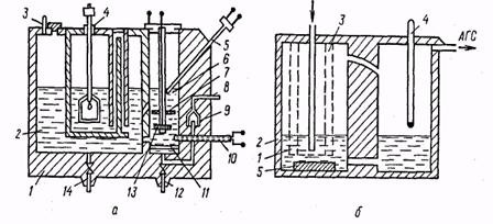 Рис. 6. Ячейки с индикаторным электродом: а – ртутным: 1 — ртутный капельный электрод; 2 — сосуд; 3 — перелив; б - графитовым: 1— графитовый индикаторный электрод; 2 — сосуд; 3 — анод; в — золотым (серебряным): 1— контактный термометр; 2 — свинцовый электрод сравнения; 3 — крышка; 4 — нагревательный элемент; 5 — серебряный индикаторный электрод; 6 — корпус; 7 — металлический диск Ячейка с ртутным индикаторным электродом (рис. 6, а) снабжена капиллярным ртутным капельным электродом 1, установленным в сосуде 2, содержащем электролит (раствор соляной кислоты), поступающий в сосуд из специальной емкости. Ртуть в капиллярный электрод поступает из емкости, в которой она хранится. Выдыхаемый воздух подается в ячейку навстречу движущемуся вдоль капельного электрода электролиту, что обеспечивает образование равномерной пленки электролита на поверхности капилляра и установление полного равновесия раствор — газовая смесь, а также систематическое образование капель электролита в нижней части капилляра. Электролиз осуществляется в каждой капле электролита, свободно висящей на конце капиллярного электрода. В такой ячейке уровень электролита под капилляром поддерживается строго постоянным с помощью перелива 3, соединенного с сосудом 2, на дне которого находится постоянный слой ртути, служащий анодом. Ячейка с графитовым индикаторным электродом (рис. 6, б) состоит из графитового индикаторного электрода 1, сосуда 2 и анода 3, покрытого ртутной амальгамой. В качестве электролита используют раствор серной кислоты, содержащий в качестве деполяризаторов анода CdSO4 или ZnSO4, чем достигается постоянство его потенциала. Анализатор, где используется указанная ячейка (анализатор Новака ), предназначен для определения концентрации кислорода в технических газах в пределах 0—1 % (об.) с постоянной времени 10 с. Ячейка с золотым (серебряным) индикаторным электродом (рис. 7, в) состоит из корпуса 6, выполненного из органического стекла, крышки из нержавеющей стали 3, на которой закреплен серебряный индикаторный электрод 5, свинцового электрода сравнения 2, нагревательного элемента 4, контактного термометра 1. На дне корпуса размещен металлический диск 7, приводимый в движение магнитной муфтой и предназначенный для перемешивания электролита. В качестве электролита используют раствор уксусной кислоты, гидроксила натрия и ацетата свинца. Анализатор Элкофлюкс, в котором используют указанную ячейку, рассчитан на следующие пределы измерения по кислороду 0—0,002; 0—0,01; 0—0,1 % (об.). Постоянная времени прибора при расходе пробы АГС 25 л/ч — 60 с. Ячейка с золотым индикаторным электродом и золотым анодом (рис. 7, а). На боковой стенке корпуса 1 из органического стекла имеются штуцер ввода пробы АГС 8 и обратный клапан 9, предотвращающий выброс электролита при колебаниях давления газа, электронагреватель 10, контактный термометр 5. В корпусе 1 размещена электрохимическая система, состоящая из рабочего электролита 6, барботажной пластины 11, индикаторного электрода 13, вспомогательного электрода 7, электрода сравнения 4, резервуара для запасного электролита 2, штуцера выхода пробы АГС 3. Рабочий электролит сливают через штуцер 12, резервный электролит — через штуцер 14. Материалом для индикаторного и вспомогательного электродов служит золото. В качестве электрода сравнения используют н