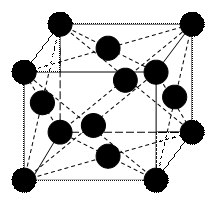 Таблица 1. Физические свойства меди. Металлы подгруппы меди, как и щелочные металлы, имеют по одному свободному электрону на один ион-атом металла. Казалось бы, эти металлы не должны особенно сильно отличатся от щелочных. Но они, в отличие от щелочных металлов, обладают довольно высокими температурами плавления. Большое различие в температурах плавления между металлами этих подгрупп объясняется тем, что между ион-атомами металлов подгруппы меди почти нет “зазоров” и они расположены более близко. Вследствие этого количество свободных электронов в единице объема, электронная плотность, у них больше. Следовательно, и прочность химической связи у них больше. Поэтому металлы подгруппы меди плавятся и кипят при более высоких температурах. Металлы подгруппы меди обладают, по сравнению с щелочными металлами, обладают большей твердостью. Объясняется это увеличением электронной плотностью и отсутствием “зазоров” между ион-атомами. Необходимо отметить, что твердость и прочность металлов зависят от правильности расположения ион-атомов в кристаллической решетке. В металлах, с которыми мы практически сталкиваемся, имеются различного рода нарушения правильного расположения ион-атомов, например пустоты в узлах кристаллической решетки. К тому же металл состоит из мелких кристалликов (кристаллитов), между которыми связь ослаблена. В Академии Наук СССР была получена медь без нарушения в кристаллической решетке. Для этого очень чистую медь возгоняли при высокой температуре в глубоком вакууме на глубокую подложку. Медь получалась в виде небольших ниточек – “усов”. Как оказалось такая медь в сто раз прочнее, чем обычная. Цвет меди и её соединений. Чистая медь обладает и другой интересной особенностью. Красный цвет обусловлен следами растворенного в ней кислорода. Оказалось, что медь, многократно возогнанная в вакууме (при отсутствии кислорода), имеет желтоватый цвет. Медь в полированном состоянии обладает сильным блеском. При повышении валентности понижается окраска меди, например CuCl – белый, Cu2O – красный, CuCl + H2O – голубой, CuO – черный. Карбонаты характеризуются синим и зеленым цветом при условии содержания воды, чем обусловлен интересный практический признак для поисков. Электропроводимость. Медь обладает наибольшей (после серебра) электропроводимостью, чем и обусловлено её применение в электронике. Кристаллическая решетка. Медь кристаллизируется по типу централизованного куба (рис 1).