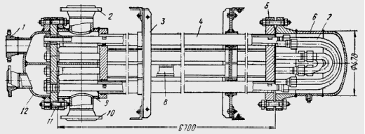 Рис. 2. Односекционный теплообменник «труба в трубе». 1 – штуцер на Dy= 100 мм и py= 40 кгс/см2; 2 – штуцер на Dy= 150 мм и py= 25 кгс/см2; 3 – опора; 4 – наружная труба; 5 – решетка для наружных труб; 6 – колпак; 7 – калач; 8 – внутренняя труба; 9 – распределительная коробка; 10 – штуцер на Dy= 150 мм и py= 25 кгс/см2; 11- решетка для внутренних труб; 12 – крышка. Расчетная часть.