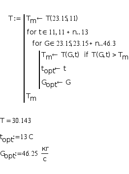 Оптимизация технологического процесса. Для данного технологического процесса (теплообмен между жидкостями) применим метод оптимизации – метод сканирования. Запишем статическую функцию объекта: T(G,t) = 26,664 – 0,0036·G + 0,274·t Составим программу оптимизации: