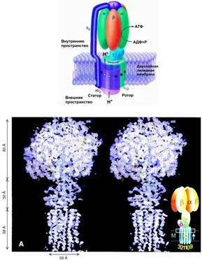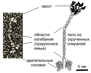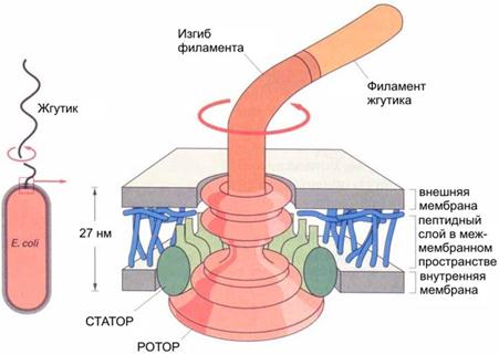 Рис. 9. Строение жгутикового мотора Как и протонные АТФсинтазы, электромоторы бактерий являются устройствами, которые в качестве источника энергии используют разность протонных потенциалов на цитоплазматической мембране. Принципы работы АТФсинтазы и бактериального мотора одинаковы, хотя сами эти конструкции различаются по своим размерам и устройству (см. рис. 9, 10). Можно с уверенностью сказать, что бактериальный мотор - аналог машины постоянного тока, созданной человеком.
