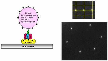 Рисунок 1. Строение и модель энзима АТФаза По мере того как протоны протекают через F0 часть энзима, γ-субъединица части F1-ATФазы вращается по часовой стрелке и идет синтез АТФ. Гидролиз АТФ происходит при вращении γ-субъединицы против часовой стрелки; при этом направление протекания протонов меняется на обратное. Субъединицы a, b, и c части F0-АТФазы формируют канал переноса протонов через клеточную мембрану. Места катализа и присоединения нуклеотидов были обнаружены исследователями (Kinosita и др., 1998) на трех а и трех b субъединицах части F1-ATФазы. γ-субъединица расположена в центре гексамера α3β3 и вращается при синтезе или гидролизе АТФ. Самое удивительное заключается в том, что АТФаза представляет собой полную аналогию макроскопических моторов, сделанных человеком, которые тоже состоят из ротора и статора. Группа исследователей из Корнелльского университета во главе с Карло Монтеманьо попыталась интегрировать этот природный наномотор [1] в НЭМС. Исследователям удалось измерить радиальное отклонение микросферы при вращении субъединицы, когда они присоединили флуоресцентную микросферу диаметром 1 мкм к γ-субъединице АТФазы (см. рис.2).