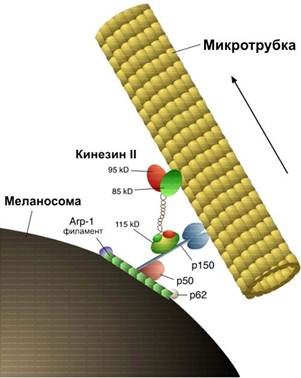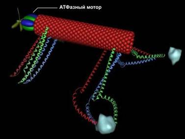 Рис. 4. Строение молекулы кинезина Интересно то, что молекула "шагает" вдоль микротрубки (см. рис.5), делая 8-нанометровые шаги. На рисунке кинезиновый комплекс перемещает органеллу меланосому (ответственную за синтез меланина) вдоль микротрубки. Для того, чтобы так шагнуть, молекула использует в качестве топлива 1 молекулу АТФ. При этом сила, развиваемая одной молекулой кинезина, составляет величину 6 пН. Если бы такой мощностью в расчете на единицу массы обладали автомобильные моторы, то они могли бы легко разгонять машины до скоростей, существенно превышающих скорость звука. Коэффициент полезного действия кинезинового мотора также велик - примерно 50%.
