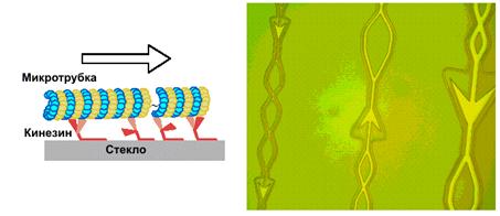Рис. 5. Перемещение кинезином меланосомы (клеточной органеллы) вдоль микротрубки В процессе "ходьбы" молекула кинезина может расщепить за одну секунду до 100 молекул АТФ, переместившись на 800 нанометров. Работая в качестве индивидуального молекулярного извозчика, кинезин может совершать перемещения на очень большие расстояния (до 1 мм).