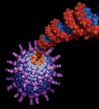 Рис. 6. Кинезиновый наноконвейер Ученые из института им. Макса Планка попытались "приручить" кинезин вне клетки. Для этого они покрыли молекулами кинезина гладкую стеклянную поверхность, создав что-то вроде ковра, ворсинки которого представляли собой молекулы кинезина. Потом исследователи разместили на этой поверхности ряд микротрубок и микросфер. Исследователи добавили к среде раствор АТФ - и получился огромный "трубочный" конвейер. Если в клетке кинезин шагает вдоль микротрубки сам, то в искусственной системе молекула была жестко закреплена, и свободные концы молекул "шагали" по микротрубкам, передвигая их. Движения микротрубок можно увидеть на этом видео. Запись велась с помощью оптического микроскопа. В дальнейшем команда планирует создать микрочипы со встроенными конвейерами, работающими в разных направлениях. Это, конечно, будет большим плюсом для будущих систем наносборки, так как НЭМС-конвейеры пока сделать достаточно трудно. Наверняка такие транспортные системы будут полезны и в лабораториях-на-чипе. Камера сгорания внутри вируса Как мы уже видели, биологические системы раньше человека использовали вращательное движение в молекулярных машинах. Ранее мы уже рассказывали о том, как молекулы РНК могут быть использованы в качестве строительных блоков для будущих наномашин. Однако до проведения этой работы профессор Пейхуан Гу описал работу вирального мотора на основе РНК-гексамера. РНК-гексамер - это комплекс, состоящий из шести отдельных РНК-мономеров.
