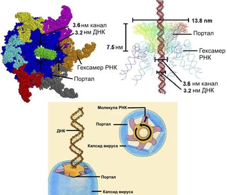 Рис. 7. Вирус phi29 выбрасывает ДНК из капсида Оказалось, что вирус-бактериофаг phi29 использует гексамер молекул РНК для выброса молекулы ДНК из капсида вируса (см. рис. 7). При этом сам процесс работы мотора похож на работу двигателя внутреннего сгорания автомобиля. Роль камеры сгорания играет портал - образование внутри капсида вируса, занятое молекулами РНК и ротором. Мономеры молекулы РНК, подобно поршням, поочередно толкают центральный пятисторонний ротор, заставляя его вращаться. Каждый РНК-мономер толкает ротор всего на 12°, потребляя одну молекулу АТФ. Таким образом, за один цикл портал поворачивается на 72°, затратив 6 молекул (см. рис. 8).