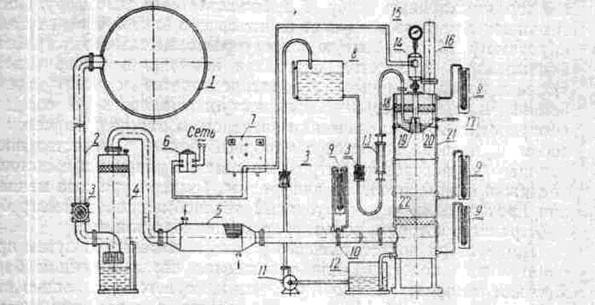 Рис. 2. Схема установки по очистке газов от окислов азота в равно проточной полой башне. Очистка газов от окислов азота в равно проточной полой башне. Схема установки показана на рис. 2. Основным аппаратом является полый равно проточный абсорбер, представляющий собой цилиндрическую башню, в верхней части которой установлен центробежный объемный распылитель. Газ, содержащий окислы азота, из общего газопровода 1 по трубе 2 через задвижку 3 поступает в аппарат барботажного типа 4, в котором регулируется степень окисленности окислов азота, а в случае необходимости и концентрация газа. Из барботера газ через теплообменник 5 и измерительную диафрагму 10 поступает в абсорбционную башню, в нижней части которой размещен экран из слоя колец Рашига 22. Благодаря экрану газ равномерно распределяется по всему сечению башни и движется противотоком навстречу диспергируемой жидкости. С целью создания равномерного движения газа по сечению в верхней части башни устанавливается второй экран 18, пройдя через который газ через выхлопную трубу 16 выбрасывается в атмосферу. Поглотительная жидкость поступает из напорного бака 8 через вентиль 3 и ротаметр 13 в приемную камеру распылительного устройства. Распыленная жидкость, благодаря наличию в башне отражательных колец 20, равномерно распределяется по всему сечению башни. Через штуцер жидкость поступает в приемный сосуд 12, оборудованный гидравлическим затвором, а оттуда забирается насосом 11 и снова подается в напорный бачок. Количество поступающего на абсорбцию нитрозного газа регулируется с помощью задвижки и измерительной диафрагмы. Температура газа меняется при прохождении через трубчатый теплообменник, в межтрубное пространство которого подается холодная вода или пар. Температура поглотительного раствора изменяется путем предварительного подогрева или охлаждения его в приемном бачке. Средняя температура в зоне реакции измеряется с помощью ртутного термометра 17. Установлено, что в полых распылительных абсорберах может быть достигнута высокая степень абсорбции окислов азота до 86— 88% и более. Очистка газов от окислов азота в аппаратах комбинированного типа.