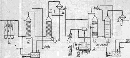 Рис. 4. Схема получения серной кислоты из малоконцентрированных газов (схема СГ — слабые газы). Улавливание сернокислотного тумана, образовавшегося в промывных башнях, производится в волокнистых электрофильтрах 4. Очищенный от примесей сернистый газ с помощью газодувки 5 направляется в контактный аппарат 7. Однако перед этим он должен быть подогрет до 420—440°С. В существующих сернокислотных системах, работающих на концентрированных газах, подогрев газа осуществляется за счет тепла реакции окисления SO2 в SO3. Если содержание SO2 в газе низкое, тепло реакции окисления недостаточно и подогрев газа до температуры контактирования осуществляется путем добавления к нему топочных газов, получаемых в результате сжигания газообразного или жидкого топлива в топке 6. В связи с этим в контактном отделении не устанавливаются теплообменники, а понижение температуры газа между слоями контактной массы осуществляется путем добавления к газу атмосферного воздуха. Получаемая в контактном аппарате трехокись серы абсорбируется в башне 8. При больших количествах холодной воды целесообразно применять для поглощения SO2 из отходящих газов водный метод очистки. Благодаря низкому парциальному давлению SO2 над водой можно достичь практически полного поглощения двуокиси cеры водой. Однако на практике водная очистка газов от SO2 не нашла широкого применения из-за большого расхода воды и загрязненности сточных вод. При промывке сернистых газов водными растворами щелочей происходит поглощение SO2 водой с образованием сернистой кислоты, которая нейтрализуется щелочью с образованием солей сернистой кислоты. Из щелочных методов наиболее перспективны те, которые обеспечивают простоту и надежность работы установки, а также получение товарных продуктов, используемых в народном хозяйстве.