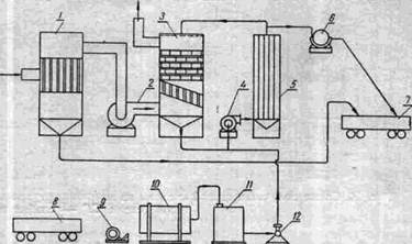 Рис. 5. Схема очистки выхлопных газов от SO2 известковым способом. Известковый метод. Принципиальная схема установки по очистке отходящих газов от SO2 известковым способом представлена на рис. 5. По этому способу отходящие газы подвергаются предварительной очистке от механических примесей (пыли, сажи) в батарейных циклонах 1, после чего с помощью газодувки 2 направляются в скруббер 3, орошаемый известковым молоком. При взаимодействии известкового молока с SO2 протекают реакции SO2 + Н2O = Н2SO3; Са (ОН)2 + SO2 = CaSO3 + 2H2O. По мере циркуляции раствора в нем накапливается соль СаSО3. Когда концентрация ее в растворе достигнет 18—20%, раствор периодически заменяется свежим. Образовавшийся сернистокислый кальций плохо растворим в воде (0,138 г/л), поэтому в системе орошения скрубберов последовательно устанавливается кристаллизатор 5, служащий для выделения кристаллов сульфита кальция. Дальнейшее выделение CaSO3 происходит на вакуумфильтре 6. Шлам, состоящий из СаSО3 и CaSO4, образующийся за счет реакции 2СаSO3+O2=2СаSO4, выводится в отвал транспортером 7 и может быть использован для производства строительных материалов. Известковый метод обеспечивает практически полную очистку газов от SO2, но требует значительного расхода извести. Содовый метод. Сущность этого метода заключается в промывке отходящих газов водными растворами кальцинированной соды. При этом протекают реакции Na2CO3 + SO2 = Na2SO + СО2, Na2SO3 + SO2 + H2O = 2 NaHSO3. Процесс поглощения SO2 содовым раствором осуществляется в аппаратах насадочного или барботажного типов. Газ проходит последовательно две башни, первая из которых орошается раствором NaHSO3, вторая — раствором Na2SO3. Содовый способ обеспечивает хорошую очистку отходящих газов от SO2 с одновременным получением товарной соли NaHSO3 и Na2SO3. Однако он не нашел широкого применения ввиду ограниченного сбыта этих солей. Аммиачный метод. Процесс очистки выхлопных газов от SOg аммиачным методом заключается в промывке газа аммиачной водой. При этом протекает реакция SO2 + 2NH3 + H2O = (NH4)2SO3; (NH4)2 SO3 + SO2 + H2O = 2 NH4 HSO3. В присутствии кислорода сульфиты окисляются до сульфатов (NH4)2SO3 + ½ O2 = (NH4)2SO4; (NH4)HSO3 + ½ O2 = NH4HSO4. Так как при взаимодействии сернистого газа с аммиачной водой получаются аммиачные соли, используемые как удобрение в сельском хозяйстве, аммиачный метод очистки газов от SO2 перспективен. Циклические методы. В основе циклических методов лежит способность двуокиси серы поглощаться при низких температурах, а затем при повышении температуры выделяться в чистом виде. В некоторых случаях для абсорбции SO2 используются твердые сорбенты. Циклические методы извлечения двуокиси серы являются наиболее эффективными и нашли применение в промышленности. Принципиальная схема извлечения и концентрирования SO2 циклическим методом показана на рис. 6. Охлажденный и очищенный от механических примесей газ поступает в абсорберы /, орошаемые поглотителем. Очищенный газ выбрасывается в атмосферу, а поглотительный раствор нагревается в теплообменнике 3