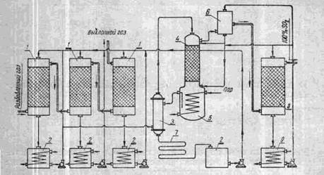 Рис. 6. Схема очистки газов от двуокиси серы циклическим методом. и направляется в отгонную колонну 4, снабженную кипятильником 5. Смесь водяных паров с SO2 поступает в конденсатор 6, а затем в холодильную башню 8, орошаемую циркуляционной холодной водой (насыщенной SO2). Водяные пары конденсируются, а чистая двуокись серы извлекается из системы. Раствор охлаждают в холодильниках 7 и 9 и собирают в емкости 2. Водный метод. Недостаток этого способа в том, что на регенерацию воды расходуется большое количество электроэнергии. Ввиду малой растворимости SO2 в воде поглотительная установка является громоздкой. Аммиачный метод. Капитальные затраты на сооружение очистных сооружений могут быть снижены, если в качестве поглотителя использовать более абсорбционноемкие поглотители (водный раствор аммиака и др.). Магнезитовый метод. Сущность процесса состоит в поглощении водной суспензии окиси магния MgO + SO2 == MgSO3. При нагреве сульфит магния разлагается на MgSO3 ®t=0 MgO + SO2 с получением товарного SO2, а окись магния снова направляется на поглощение. Как и в случае аммиачного способа часть (до 10°/о) сульфита магния в растворе окисляется в сульфат 2MgSO3 + O2 = 2MgSO4. Эта часть раствора должна быть компенсирована свежим. В производственных условиях рабочий раствор, содержащий MgSO3 и MgSO4 в шламе, непрерывно циркулирует в системе. Магнезитовый способ прост и обеспечивает полную очистку газов от 50г. При этом расходуется незначительное количество сырья-магнезита. Однако из-за больших энергетических затрат и громоздкости технологического оборудования он не получил широкого применения. Цинковый метод. Этот способ очистки газов от SО2 аналогичен магнезитовому, но в качестве поглотителя используется суспензия окиси цинка Отличительной особенностью цинкового способа является то, что на очистку можно подавать газы при высокой температуре (200—250°С). Газ должен быть предварительно очищен от пыли. Комбинированные методы. Комбинированные методы не позволяют возвращать в систему поглотительный раствор для повторного использования. Выделение двуокиси серы здесь происходит с попутным получением других побочных продуктов. Аммиачно-сернокислотный метод. При поглощении двуокиси серы аммиачной водой образуются сернистокислые соли, которые под действием серной кислоты разлагаются с получением 100%-ного SO2 и сульфата аммония 2NН4НSОз+ Н3SO4 = (NН4)2SO4 + 2SO2 + 2H2O; (NH4)2 SО3 + Н2SО4 = (NН4)2SO4 + SO2 + Н2O. Из перечисленных методов наиболее простыми и выгодными являются методы прямой нейтрализации и окисления. На втором месте стоят комбинированные методы. Из циклических методов наиболее перспективными являются аммиачный и ксилидиновый. Недостаток всех перечисленных методов — их громоздкость и большие капитальные затраты. Стоимость очистки выхлопных газов с малой концентрацией SO2 может быть значительно снижена, если применить эффективное оборудование и получать продукт, пользующийся большим спросом в народном хозяйстве. Полые распылительные абсорберы при меньшей стоимости и меньшем гидравлическом сопротивлении в 3—4 раза превосходят по эффективности аппараты насадочного типа; полые башни проще в изготовлении, имеют меньший вес и не засоряются в процессе эксплуатации. Применяемый для поглощения двуокиси серы водный раствор сульфита аммония отличается большой химической емкостью. При очис