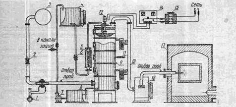 Рис. 18. Очистка газа от сероводорода в полой башне. Газ на очистку поступал из газохода 3 через вентиль 2 в башню 9. Расход газа контролировался диафрагмой /. Поглотительный раствор поступал в башню из банка 4 через вентиль 6 и ротаметр 5. Температура и давление в башне контролировалось термометром 11 и манометром 10. Очищенный газ отводился через газоход 13 в смеситель 16, куда поступал также и воздух; далее газовая смесь поступала в печь 17. Отработанный раствор из башни 9 поступал в сборник 8 и насосом 7 подавался на рециркуляцию. Поглощение сероводорода из газов раствором цианамида кальция с получением тиомочевины. Донецким институтом ИРЕА совместно с Днепропетровским химико-технологическим институтом проведены исследования по очистке газов от сероводорода раствором СаСN2 с получением тиомочевины. Абсорбция газов раствором цианамида кальция протекает с большой скоростью. Степень поглощения сероводорода из коксового газа в механическом абсорбере достигала 98—99%. При этом в растворе образовывалась тиомочевина, которая отделялась от Са(Н8)г на фильтре и после кристаллизации представляла собой стандартный продукт. Очистка газов от сероводорода с получением сульфида аммония. Водный раствор аммиака является хорошим поглотителем сероводорода. Взаимодействие NНз и Н2S протекает по уравнениям NН3 + Н2S = NH4HS; 2 NН3 + Н2S = (NН4)2S. Однако этот метод до сих пор не нашел практического применения вследствие сложности и дороговизны регенерации сульфидных соединений аммония с возвратом аммиака в процесс. Устранение дорогостоящей и сложной операции (регенерации раствора с возвратом аммиака в процесс) делает этот метод экономически рентабельным. Указанный метод обеспечивает полную очистку газа от сероводорода с одновременным получением сульфида аммония. Очистка коксового газа от сероводорода и других примесей торфоаммиачным поглотителем. Основными недостатками существующих методов очистки коксового газа является многостадийность процесса, громоздкость аппаратуры, большие капитальные и эксплуатационные затраты. С целью устранения этих недостатков исследован процесс очистки коксового газа с помощью торфощелочного сорбента в непрерывно действующем аппарате с кипящим слоем. Отличительной особенностью этого метода является его непрерывность, одностадийность, компактность и попутное получение дешевых органоминеральных удобрений. ОЧИСТКА ГАЗОВ ОТ СО2 В настоящее время в промышленной практике применяются в основном три метода очистки газа от СО2: водная, щелочная (NаОН или Nа2СОз) и моноэтаноламиновая. Очистка газа водой осуществляется под давлением 12—30 атм и при этом степень очистки не превышает 80%. Метод требует больших расходов электроэнергии. Очистка газа щелочью является дорогостоящей операцией и поэтому применяется лишь для поглощения малых концентраций СО2. Наиболее совершенной является моноэтаноламиновая очистка, которая находит все более широкое применение. Исследовали следующие методы: поглощение СО2 водноаммиачным раствором с одновременным полученим углеаммонийных солей; поглощение СО2 суспензией СаSO4 в аммиачной воде с одновременным получением сульфата аммония; поглощение СО2 раствором гидросульфида кальция с выделением в газовую фазу сероводорода; интенсификация процесса очистки газа от СО2 раствором моноэтанолам