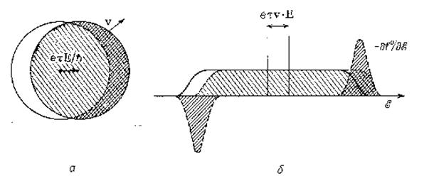 Фиг.97. а – смещенная поверхность Ферми; б – смещенное распределение Ферми. Небольшая добавка появляется с той стороны, где vk×eE>0, т. е. там, где электроны ускоряются полем. Та же величина вычитается с противоположной стороны. Фактически по теореме Тейлора можно написать