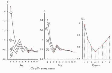 Рис. 3. Графики значений R-функции систем электронных подоболочек атомов химических элементов по группам таблицы Д.И. Менделеева График зависимости значений R-функции от порядкового номера элементов (рис.1) имеет периодический, в целом затухающий характер. В горизонтальном направлении таблицы во всех рядах наблюдается одна и та же закономерность: последовательное понижение значений R-функции в начале ряда и повышение значений по мере приближения к его концу, что коррелируется с общим характером ослабления металлических свойств химических элементов в начале периодов и усилением металлоидных свойств в их конце. Обобщенной наглядной иллюстрацией этого является график средних значений R-функции по группам таблицы Д.И. Менделеева (рис. 3), глубокий минимум которого соответствует четвертой группе. При этом обращает на себя внимание тот факт, что типические элементы четвертой группы – углерод и кремний – занимают главенствующее положение по разнообразию соединений с другими элементами соответственно в живой и неживой природе, причем углерод обладает минимальным значением R-функции (0,631) среди всех химических элементов. Большой