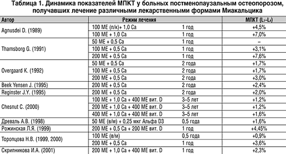 Первоначально эффект кальцитонина лосося при остеопорозе на качество кости оценивался у животных – овароэктомированных овцах, у которых развивался остеопороз. Двойное слепое 6–месячное исследование проведено на 28 овцах, которые были разделены на 4 группы: 1–я – получала подкожно изотонический раствор, 2–я – 50 МЕ кальцитонина лосося, 3–я – 100 МЕ кальцитонина лосося, 4–я – группа контроля (овцы с сохраненными яичниками). Шейка бедренной кости обследована с помощью МР–микроскопии с использованием трехмерного измерения. Данное исследование показало, что лечение кальцитонином лосося 100 МЕ статистически достоверно улучшало все параметры трабекул – объем трабекул, их количество, количество трабекулярных перетяжек и среднюю их длину; улучшились биомеханические свойства трабекулярной кости – получен дозозависимый эффект на компрессионное напряжение (устойчивость к сжатию). Эффект Миакальцика на качество кости у женщин с остеопорозом был выявлен в ходе проведения 2–летнего рандомизированного плацебо–контролируемого исследования QUEST (Qualitative Effects of Salmon Calcitonin Therapy), в которое была включена 91 женщина с постменопаузальным остеопорозом и по крайней мере с 1 переломом позвонка. Изучались эффекты ежедневного приема спрея Миакальцик 200 МЕ + 500 мг кальция на качество, количество кости и костный обмен. Качество кости изучалось с помощью МР–микроскопии архитектоники трабекулярной кости в области запястья и бедра. Кроме того, проводилась гистоморфометрия биоптата из крыла подвздошной кости. Количественная оценка кости изучалась с помощью измерения МПКТ, костный обмен оценивался с помощью костных маркеров, включая С– и N–терминальные телопептиды коллагена 1 типа и костную щелочную фосфатазу. Лечение в течение 24 месяцев назальным спреем Миакальцик 200 МЕ привело к статистически достоверному улучшению параметров качества кости, изученных с помощью МР–микроскопии в области запястья и бедра, а гистоморфометрия свидетельствовала о стимуляции костеобразования – было выявлено значимое повышение числа остеобластов на единицу поверхности кости за период лечения. Таким образом, Миакальцик (кальцитонин лосося) является эффективным средством лечения постменопаузального остеопороза, длительное его применение приводит к достоверному снижению частоты переломов (в первую очередь, позвонков) и улучшению качества кости. В настоящее время ведутся работы по разработке новых лекарственных форм и новых показаний для назначения Миакальцика. Уже разработана таблетированная форма препарата, удалось найти способ, предохраняющий от переваривания его в желудочно–кишечном тракте. Приоритетным направлением является документальное подтверждение безопасности и клинической эффективности новой таблетированной формы препарата. Список литературы 1. Lips P. Epidemiology and predictors of fractures associated with osteoporosis. Am J Med, 1997;103(2A): 3–11. 2. Gullberg B., Johnell O., Kanis J. World–wide projections for hip fracture. Osteoporosis Int., 1997; 7: 407–413. 3. Marshall D., Johnell O., Wdel H. Meta–analysis of how well measures of bone mineral density predict occurrence of osteoporotic fractures. BMJ 1996; 312: 1254–1259. 4. Ravn P., Rix M., Andreassen H., et al. High bone turnover is associated with low bone mass and spinal fracture in postmenopausal women. Calcif. Tissue Int. 1997; 60: 255–260. 5. Van Daele P., Seibel M., Burger H., et al. Case–control analysis of bone resorption markers, disability, and hip fracture risk: the Rotterdam study. BMJ 1996; 312: 482–3. 6. Garnero P., Sornay E., Chapuy M–C., Delmas P. Increased bone turnover in late postmenopausal women is a major determinant of osteoporosis. J Bone Miner 