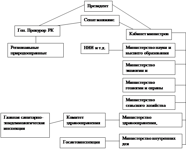 Конституцией Казахстана законодательные функции по вопросам охраны природы возложены на Парламент республики, который осуществляет право собственности на землю и ее недра, леса, воды, растительный и животный мир и другие природные ресурсы, разрабатывает и совершенствует законодательство об охране окружающей природной среды и отдельных частей биосферы, определяет государственную экологическую политику и международное сотрудничество в области использования ресурсов и охраны окружающей среды, осуществляет контроль за исполнением природоохранительного законодательства. В РК приняты следующие законы и кодексы (своды законов) по основным вопросам природопользования, сохранения и воспроизводства, а также охраны природы. Так, в 1980 г –Закон об охране атмосферного воздуха, В 1990 г – Земельный Кодекс, В 1991 г – Закон о земельной реформе, В 1991 г – Закон об охране окружающей природной среды, В 1992 г – Закон об охране здоровья народа, В 1992 г – Кодекс о недрах и переработке минерального сырья, В 11993 г – Лесной, водный, кодексы и закон об охране, использовании и воспроизводстве животного мира. Правительством республики возложены обязанности по охране отдельных частей биосферы на министерства и государственные комитеты. Министерство науки и высшего образования, Национальная Академия Наук руководит вопросами внедрения в производство передовой техники и технологий в области природопользования, сохранения и воспроизводства, а также защиты природных ресурсов. Министерство экологии и биоресурсов пользуется правом подведомственного управления и контроля за деятельностью министерств и ведомств, предприятий и организаций в области охраны окружающей среды и т.д. Министерство геологии и охраны недр отвечает за охрану минерально-сырьевых ресурсов, регулирует использование и охрану подземных вод. Комитет здравоохранения осуществляет ведомственный контроль за состоянием природной среды с точки зрения охраны здоровья граждан. Министерство сельского хозяйства осуществляет ведомственный контроль за соблюдением Земельного Кодекса, использованием химических средств защиты растений и минеральных удобрений. Министерство внутренних дел ведет надзор за соблюдением правил охраны атмосферного воздуха и водных источников транспортными средствами и землеройной техникой. Комитет по водному хозяйству контролирует соблюдение требований Водного Кодекса, отвечает за состояние охраны водные ресурсов от загрязнения, засорения и истощения. Комитет по гидрометеорологии обеспечивает охрану атмосферного воздуха от загрязнения, проводит физическое наблюдение за состоянием воздуха, водоемов и поверхности почвы. Высший надзор за точностью и единообразным, а также неуклонным соблюдением правоохранительного законодательства всеми министрами, ведомствами, предприятиями и организациями, контролирующими органами, должностными лицами и гражданами возложен на Генерального прокурора РК и подчиненных ему территориальных и природоохранных прокуроров. Закон об окружающей природной среде устанавливает дисциплинарную, материальную, административную и у головную ответственность за нарушение природоохранительного законодательства,, причинения вреда окружающей среде либо создание реальной угрозы его причинения. Привлечение к ответственно