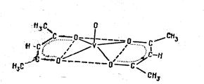 рис 1. Органический комплекс ванадия, обладающий каталитической активностью в органических реакциях. Комплексные ванадиевые соединения с органическими реагентами (рис. 1) находят применение в аналитической химии. Однако вопрос о состоянии ионов ванадия в этих соединениях и сегодня нельзя считать выясненным до конца. Особенно это относится к состоянию ванадия (V). Во многих случаях даже не определено, в какой форме — катионной или анионной — находится ванадий в органических соединениях. При образовании большинства органических соединений с ванадием он может быть в составе либо катионов VO3+, VO2+, VO(OH)2+, либо в виде анионов V4O112- и V6O174-. Многие комплексы ванадия с органическими реагентами интенсивно окрашены и способны к изменению цвета в зависимости от условий процесса и характера среды. Все же следует сказать, что химия органических соединений ванадия еще ждет своих исследователей. I.8. Потенциальная опасность для здоровья Наибольшему воздействию при вдыхании содержащей ванадий пыли подвержены легкие, бронхи, глаза. Рабочие, вдыхавшие такую пыль даже непродолжительное время жалуются на раздражение и хрипы в легких, кашель, боли в груди, насморк и першение в горле. Иногда наблюдается удушье, зеленоватый налет на языке и побледнение кожных покровов. Правда, эти признаки исчезают уже вскоре после прекращения вдыхания загрязненного воздуха. Аналогичные результаты были получены и на животных. По данным Агентства по учету токсических веществ и болезней США. Других типов воздействия ванадия на организм человека не наблюдается. Данные об отрицательном влиянии ванадии при его поступлении с пищей или при кожном контакте отсутствуют. Тем не менее, опыты, проводившиеся на животных показали, что воздействие сверхвысоких доз ванадия приводит к смертельному исходу. У беременных животных, подвергавшихся воздействию несколько меньших доз наблюдались дефекты у новорожденных. У животных, долгое время вдыхавших или получавших с пищей значительные количества ванадия появлялись незначительные проблемы с печенью и почками. Следует отметить, что те дозы ванадия, которые использовались в опытах многократно превышают концентрации, имеющие место в природе. Департамент здравоохранения США, Агентство по исследованию рака и Агентство по охране окружающей среды США не относят ванадий к числу канцерогенов. При исследовании животных, длительное время получавших повышенные дозы ванадия с водой, рост числа опухолевых заболеваний не выявлен. I.9. Физиологическое значение Суммируя различные источники, можно сказать, что ванадий - это микроэлемент, участвующий в регулировании углеводного обмена, сердечно-сосудистой деятельности (в частности, уменьшает выработку холестерина). Ванадий участвует также в процессах формирования костей и зубов, роста и метаболизма жиров, а также стимулирует рост и репродукцию клеток, действуя при этом как противораковое средство. Ванадий вместе с цирконием, сопутствуя серебру, благотворно действует на функции паренхиматозных органов (печень, селезенка, легкие), щитовидной и поджелудочной желез, гипофиза, половых органов, мышечной системы. Хотя дефицит ванадия у человека - редкое явление, однако у подопытных животных нехватка ванадия приводит к ухудшению роста зубов, костей, хрящей и мускулов, а также ослаблению функц