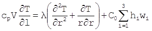 0 < r £ R, 0 < l £ L Кинетические константы: A1 = 2,6127 с—1, А2 = 0,2079 с—1, A3 = 0,3189 с—1, B1 = 5,1413 м3/(моль*с), B2 = 4,6351 м3/(моль*с), В3 = 0.8173 m3/(моль*с), (5.7) F1 = 0,0056 м3/(моль*c), F2 = 0,0219 м3/(моль*c), F3 = 0,0121 м3/(моль*c), D1 = 0,1328 м3/(моль*с), D2 = 0,1085 м3/(моль*с), D3 = 0,0678 м3/(моль*с) где co — начальная концентрация бензола; l — координата по длине трубки; Ср — объемная теплоемкость потока; hi — тепловые эффекты стадий; К — коэффициент теплопередачи через стенку трубки; l - коэффициент теплопередачи от стенки к хладагенту; Тх — температура хладагента; Т — температура катализатора; dtр — диаметр трубки; V — линейная скорость газа; D - коэффициент эффективной радиальной диффузии; r — координата по радиусу трубки; L – максимальная длина трубки; R – максимальный радиус трубки. Для peшeния системы уравнений (5.5) использовали конечно разностный метод. Время расчета 2 - 10 секунд. 5.1.3 Метод решения уравнений математической моделиПолученную систему дифференциальных уравнений (5.2) второго порядка будем решать по конечно разностной схеме , так как метод конечных разностей является одним из эффективных методов решения систем нелинейных дифференциальных уравнений /9/. 5.1.4 Выбор варьируемых параметров и критерия оптимизацииКонцентрация малеинового ангидрида - СМ(t,l,r) это функция, зависящая от температуры смеси t, длины l и радиуса трубы рактора r. Из-за свойств катализаторов, взрыво- и пожаробезопасности малеинового ангидрида, увеличения проскока бензола температурный режим задают. Таким образом будем варьировать только длину l и радиус r трубок реактора. Критерием оптимизации выбрана выходная концентрация малеинового ангидрида исходя из предположений, что на стоимость производства в основном влияет себестоимость сырья. Таким образом необходимо найти такое значения длины l и радиуса трубы реактора r , при которой концентрация малеинового ангидрида СM будет максимальной. 5.1.5 Постановка задачи оптимального проектированияНайти l и r трубы реактора производства малеинового ангидрида, при которых CМ à max, уравнения связи: