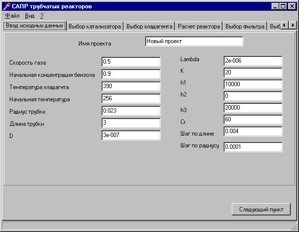 ЗАКЛЮЧЕНИЕ В результате выполнения дипломного проекта был выполнены следующие разработки: - Поставлена задача на проектирование; - Построена структурная схема САПР; - Построена функциональная схема САПР; - Разработана математическая модель трубчатого реактора; - Поставлена задача оптимального проектирования и создана программа ее решающая; - Разработана подсистема ввода-вывода; - Разработана подсистема визуализации; - Разработана информационно-поисковая подсистема; - Разработана подсистема выбора вспомогательного оборудования; - Разработана подсистема выбора катализатора; - Разработана подсистема выбора хладагента; - Разработана подсистема формирования документации. Разработанная САПР позволяет проектировать реакторы синтеза малеинового ангидрида. Главным достоинством данной САПР является повышение качества малеинового ангидрида, значительное облегчение труда проектировщика, уменьшение затрат при проектировании. СПИСОК ИСПОЛЬЗУЕМЫХ ИСТОЧНТКОВ 1. Молдавский Б.Л., Кернос Ю.Д., Малеиновый ангидрид и малеиновая кислота, Л. «Химия», 1976; 2. Муша Ж.Э., Гиллер С.А., Шиманская М.В. и др., Получение малеинового ангидрида парофазным окислением бензола. Л., «Химия», 1978; 3. Гуревич Д.А., Фталевый ангидрид, М. «Химия», 1968; 4. Темкин М.И. Научные способы подбора и производства катализаторов. Новосибирск. «Наука», 1964; 5. Литовка Ю.В., Кузнецов А.А., Моделирование и оптимизация технологических объектов в САПР: Лаб. практимум. Тамбов, ТГТУ, 1996; 6. Балакирев В.С., Воронов Н.В., Глазырин И.М., Ермаков Н.Н., Малыгин Е.Н., Определение коэффициентов математической модели реактора окисления бензола до малеинового ангидрида, Труды ТИХМа, Тамбов 1971; 7. Горелик А.Г, Балакирев В.С., Любарский А.Г., Ермаков Н.Н., Малыгин Е.Н., Вопросы математического моделирования и оптимизации реактора получения малеинового ангидрида из бензола, в сб. «Всесоюзная конференция по химическим реакторам», Новосибирск, 1971; 8. Иоффе И.И., Любарский А.Г. «Кинетика и катализ», 1962; 9. Самарский А., Сеточные методы. М., «Наука», 1979; 10. Иванов А.В., Численные методы. Л. «Мир», 1984. ПРИЛОЖЕНИЕ А СХЕМА ТЕНОЛОГИЧЕСКИХ СТАДИЙ ПРИЛОЖЕНИЕ БСХЕМА САПР СТРУКТУРНАЯПРИЛОЖЕНИЕ ВСХЕМА САПР ФУНКЦИОНАЛЬНАЯ ПРИЛОЖЕНИЕ ГРЕЗУЛЬТАТ ОПТИМИЗАЦИИ |