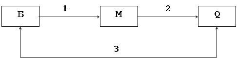 где Б — бензол; М — малеинивый ангидрид; Q — продукты сгорания: 1, 2 и 3 — маршруты образования продуктов. Рисунок 2 – Схема кинетического окисления бензола Скорости образования продуктов определяются из выраженнй: