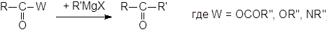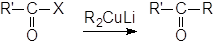 Также интересна реакция алкил-де-ацилокси-замещения (превращение ангидридов, сложных эфиров и амидов карбоновых кислот в кетоны с помощью металлоорганических соединений), с помощью котрой можно получать кетоны из соединений других классов. Как и ацилгалогениды, ангидриды и сложные эфиры карбоновых кислот при обработке реактивами Гриньяра дают третичные спирты. Для увеличения выхода кетона применяют низкие температуры и обратный порядок смешения реагентов. Реакции сочетания ацилгалогенидов.Известны также интересные реакции сочетания ацилгалогенидов, в результате которых можно получать симметричные a-дикетоны.