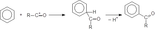 Имеются, однако, некоторые указания, согласно которым, если бы комплекс с AlCl3 не возникал, то кетон образовывал бы комплекс с ионом ацилия, который не мог бы атаковать основной субстрат, в данном случае бензол.