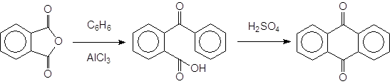 Причем если радикал имеет сильно разветвленное строение, то может происходить отщепление C=O, и в этом случае вместо ожидаемого ацилирования будет наблюдаться алкилирование субстрата: Интересным примером использования реакции Фриделя-Крафтса может быть следующая двухстадийная и весьма важная в синтетическом отношении реакция: