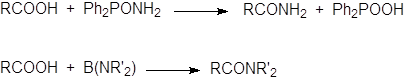 Кислоты можно превратить в амиды также нагреванием с амидами других карбоновых кислот (обмен), сульфоновых или фосфиновых кислот или действием трис(алкиламино)боранов [B(NHR’)3] или трис(диалкиламино)боранов [B(NR’2)3]: Ацилирование аминов сложными эфирами.Превращение сложных эфиров в амиды – полезный метод синтеза незамещенных, N-замещенных и N,N-дизамещенных амидов из соответствующих аминов.