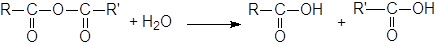 Ацилгалогениды очень реакционноспособны, поэтому гидролиз проходит легко. Большинство галогеноангидридов простых кислот следует хранить в безводных условиях, так как они реагируют с влагой воздуха. Поэтому обычно вода оказывается достаточно сильным нуклеофилом для проведения реакции гидролиза, хотя в отдельных случаях необходимо использовать гидроксид-ион. Реакция, как правило, не имеет синтетической ценности, так как ацилгалогениды обычно получают из кислот. Реакционная способность ацилгалогенидов изменяется в следующем ряду: F<Cl<Br<I. При использовании в качестве нуклеофила карбоновой кислоты возможна реакция обмена. Гидролиз галогеноангидридов обычно не катализируется кислотами, за исключением ацилфторидов, когда образование водородной связи может способствовать отщеплению фтора. Гидролиз ангидридов.